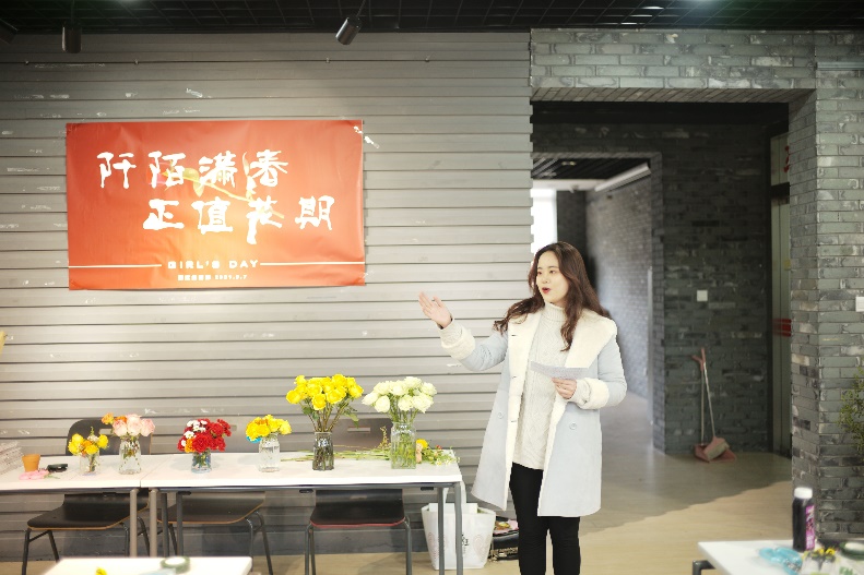 活动正式开始,主持人为大家送上女生节祝福,之后由花艺老师为大家介绍工具和花材。