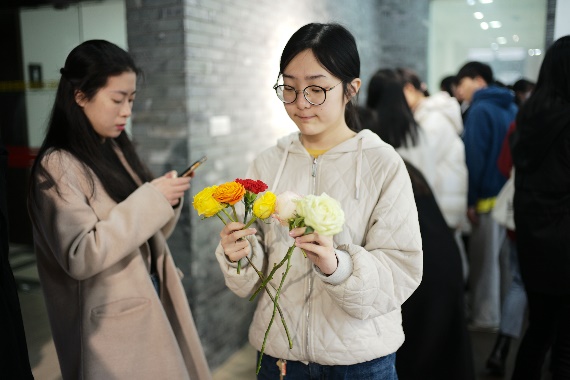 活动现场鲜花种类丰富,供同学们自由挑选。同学们在准备好的花丛中剪下自己心仪的花枝,准备妥当后,陆续开始了自己独特的花艺创作之旅~