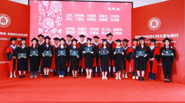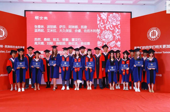 毕业生代表本科生刘雯婷、硕士研究生凯撒(哈萨克斯坦)发言