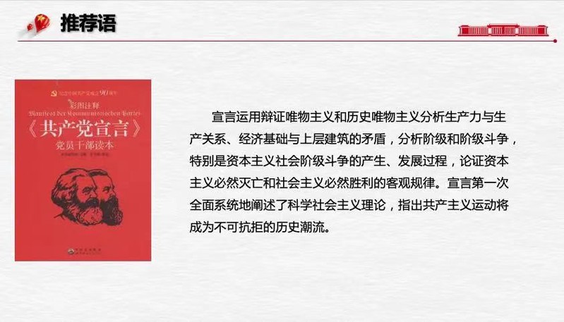 为了做好此次分享,支部的党员们都做了充分准备。在此次分享会上,文艺学专业的王润茁同学,她推荐了《共产党宣言》。在她看来,《共产党宣言》第一次全面系统地阐述了科学社会主义理论,指出共产主义运动将成为不可抗拒的历史潮流,值此建党百年之际,重温宣言必将给党员带来勇毅前行的力量。