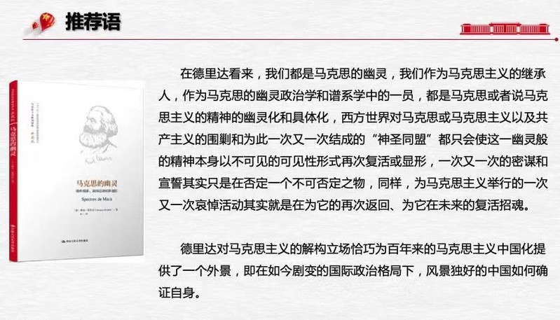 文艺学专业的贺诗元同学报告学习《马克思的幽灵》这本书的感受,他觉得德里达对马克思主义的解构立场恰巧为百年来的马克思主义中国化提供了一个外景,作为马克思主义的继承人,作为马克思的幽灵政治学和谱系学中的一员,都是马克思或者说马克思主义的精神的幽灵化和具体化,西方世界对马克思主义的围追堵截恰好确证了马克思主义的显形,在如今剧变的国际政治格局下,风景独好的中国正是这一个个幽灵中最强大的一环。