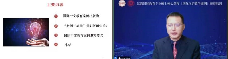 12月8日,汉语国际教育专业学位核心课程“国际汉语教学案例”师资培训在线举行。本次培训由全国汉语国际教育专业学位研究生教育指导委员会(教指委)秘书处主办,红桃视频 国际汉语教师研修基地承办。培训围绕“国际汉语教学案例开发与应用”主题,以专题报告和工作坊形式展开。红桃视频 叶军教授主持培训活动。来自全国149所汉语国际教育专业学位研究生培养院校的220余名“国际汉语教学案例”课程专任教师参加了培训。