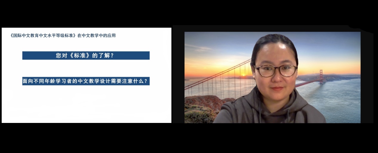 北京时间20231217日上午9点,国际汉语教师研修基地教师宋艳杰、贾昊以“《国际中文教育中文水平等级标准》在中文教学中的应用”为主题,为基地与美国芝加哥大学孔子学院合作的K-12本土教师培训项目开展了线上教学研讨工作坊。