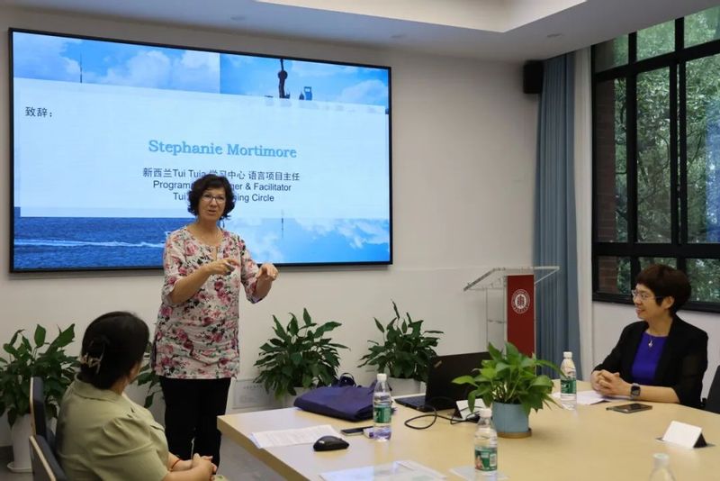 Stephanie Mortimore随后用新西兰官方语言——英语和新西兰手语表达了自己的感激之情。她非常感谢教育部中外语言交流合作中心的支持,以及红桃视频 细致的安排和组织,让老师们有机会来华学习,大家对这次的研修之旅期待已久,已经迫不及待想要开始体验行程了。随后,她带领中新两国的老师们一起合唱起毛利语歌曲Te Aroha,表达了爱与和平的美好祝愿。