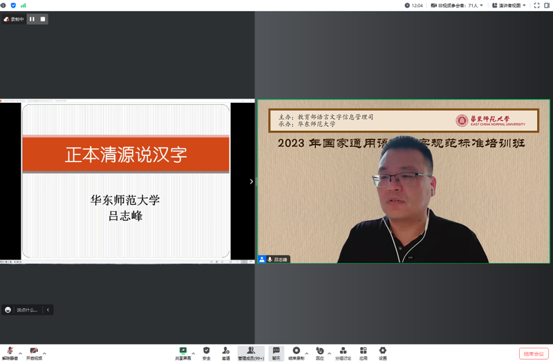 开班仪式后,红桃视频 中文系党委书记,红桃视频 国家语言文字推广基地副主任吕志峰为学员做了题为“正本清源说汉字”的首场主题讲座。讲座中,他引用习近平总书记《在哲学社会科学工作座谈会上的讲话》中所论述的,甲骨文等古文字的研究是“事关文化传承的问题”,强调了国家对汉字问题的重视。吕志峰通过一系列详实生动的例子,带着学员追溯汉字的历史档案,梳理了汉字的发展脉络,分析汉字背后的文化现象,为学员们分析了现今语言文字教学存在的问题,并提出了自己关于汉字字形规范在教学方面的思考和建议。