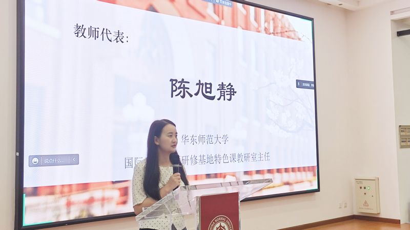 基地特色课教研室主任陈旭静作为教师代表给学员们送上了祝福,她表示,通过五周的培训,大家都有了实实在在的进步,很开心在大家不断成长的道路上,自己既是参与者也是见证者。祝愿各位学员在国际中文教师的路上不断前行,收获更丰盈的果实。