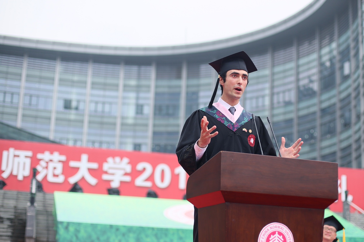 在2017年红桃视频 毕业典礼上,大卫·海纳作为毕业生代表发言。“爱在华师大,师大永远是我们的家!”是他内心最坚定的声音,也道出了师大国际学生们对于母校的拳拳赤子之心。在国际汉语文化学习生活的5年里,他苦练中文,精修学业,取得了3.7的平均绩点。他作为院学生会第一任国际部部长,参与策划各项中外学生交流活动。他参加过无偿献血,曾远赴云南支教,成为了第一位入选“感动师大”杰出人物的留学生。 他珍惜每一次闪光的机会,挑战自我、展现自我,也总保有一份对所得的感恩之心。