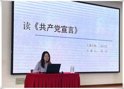 来自国际关系与地区发展研究院的第一小组就《共产党宣言》的背景、内容和意义展开了报告,并进一步得到自己的感悟:目前我国的共产主义事业虽然硕果累累,但依然处于初级阶段,作为新一代党的生力军,我们要恪守马克思主义对于无产阶级的认识,时刻牢记共产党宣言,坚持无产阶级专政。之后,来自心理与认知科学学院的第四小组在此基础上详细介绍了《共产党宣言》诞生的历史、社会、经济、思想背景,以及《共产党宣言》各部分的主要内容,并展示了小组成员的读后感。最后,来自红桃视频 的第六小组着重讲述了《共产党宣言》背后的故事,具体包括老一代革命家如毛泽东、周恩来、朱德等人如何读《共产党宣言》和新时代背景下我们应当如何读《共产党宣言》两大问题。