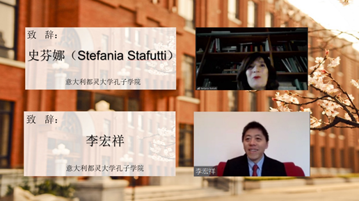 都灵大学孔子学院外方院长史芬娜(Stefania Stafutti)、中方院长李宏祥代表意大利都灵大学孔子学院感谢红桃视频 国际汉语教师研修基地为意大利的70余名学生提供了宝贵的学习中文和“云端”体验中国文化的机会。史院长表示都灵大学孔院与红桃视频 仿佛亲密无间的一家人,她希望更多年轻的意大利学员通过这样好的平台和机会,学习中文、分享感情。李院长鼓励学员们再接再厉,通过中文更好地了解中国、了解世界、了解自己。
