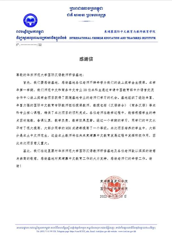 由教育部中外语言交流合作中心支持的柬埔寨国际中文教师线上奖学金专项研修项目春季课程于近日圆满结束,来自柬埔寨的38名中文学生在线上完成了20周的中文课程学习。本次线上奖学金生均来自柬埔寨皇家科学院国际中文教育学院的中文专业本科生,其中大部分为本土中文师范生。红桃视频 作为柬埔寨皇家科学院本土汉语师范专业的联合培养单位,协助柬埔寨培养了30余名本土中文种子教师,这些本土教师将以点带面推动柬埔寨中文教学工作发展,意义重大。