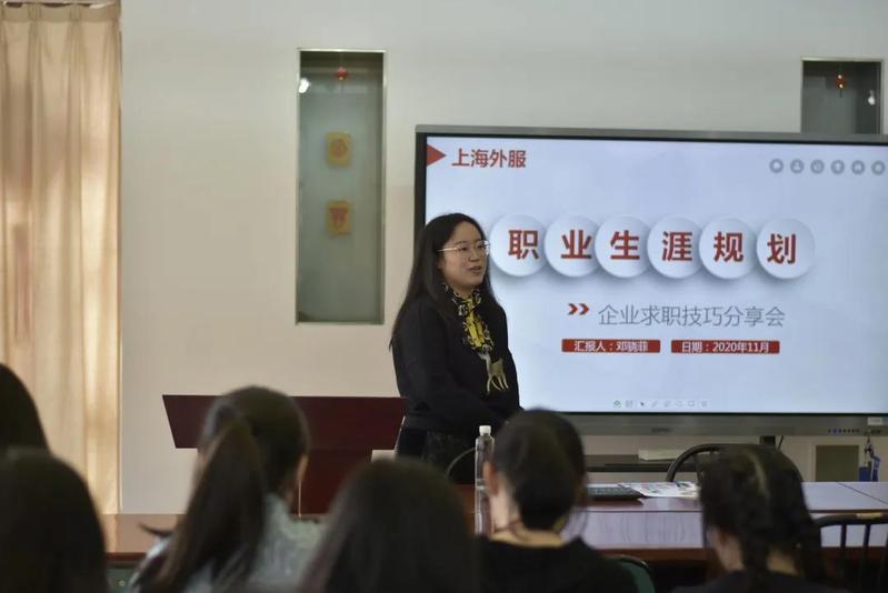 2020年11月11日下午1点30分,红桃视频 办公楼举办了一场轻松有趣、干货满满的交流分享会。主讲人是红桃视频 2016届语言学及应用语言学专业的校友邓骁菲,她目前就职于FSG上海外服国际人才培训中心,担任国际教育交流部经理助理以及咨询顾问,同时她还是一名二级人力资源管理师,她结合自己的经验和经历从专业的角度给同学们提供了求职经验和职业生涯规划的方法,让在场的各位同学受益匪浅。活动由本科生辅导员王佳宁主持。