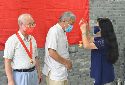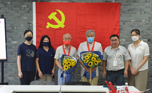 此次教育活动特别邀请了今年红桃视频 两位获得“光荣在党50年”纪念章的老党员陈勤建教授、朱希祥教授出席。首先,王志介绍了两位老党员简要在党经历和为学院专业发展所做出的贡献。接着,黄美旭为两位老党员颁发并佩戴纪念章并代表学院祝贺两位老师,新生党员向两位老党员献上了鲜花。