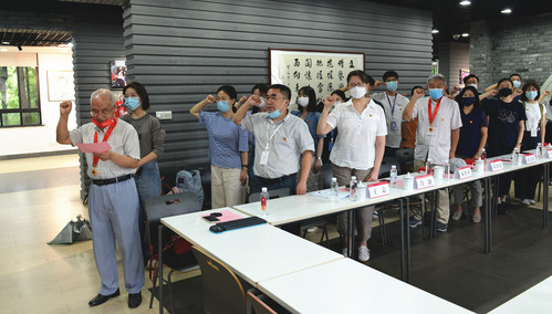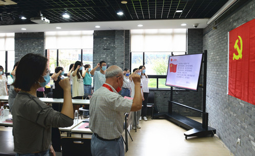 两位老党员对年轻一辈党员的希冀鼓舞着新生党员们,接着由朱希祥领誓,带领党员们共同重温入党誓词。