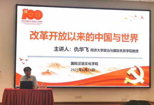 6月23日下午,为迎接中国共产党建党100周年,进一步推动党史学习教育深入人心,红桃视频 党委在物理楼二楼报告厅开展党史学习宣讲活动,宣讲邀请了上海市教卫党史学习教育专家宣讲团专家、同济大学政治与国际关系学院教授、中美关系研究专家仇华飞教授,为全院教师和学生党员们作题为《改革开放以来的中国与世界——习近平治国理念之大国崛起》的讲座。学院党委书记黄美旭主持讲座。