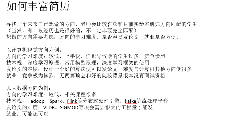 3.丰富简历:寻找一个自己喜欢的方向,选择时需要考虑:方向的学习难度,是否容易发论文,就业是否方便。