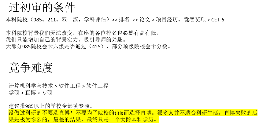 2.过初审条件:本科院校(985、211、双一流,学科评估)>>排名>>论文>项目经历、竞赛奖项>CET-6。