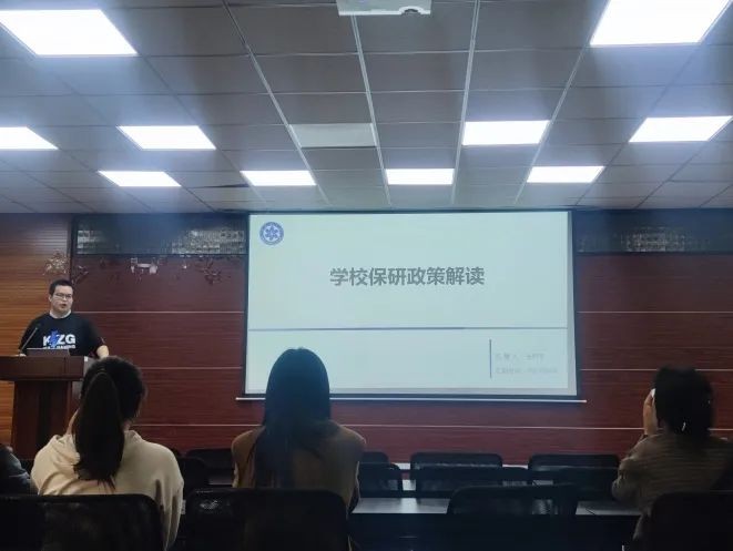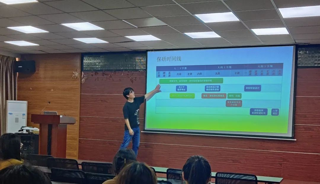 在交流会上晏栖桐学长,用自己的亲身体会为同学们讲解保研的流程。