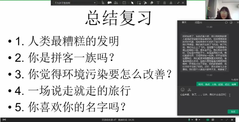 考虑到学员均为中学生,平时有一定的学业负担与大量课外活动安排,同时也具备了自主学习的动机与能力,因此课程平台选用了ClassIn,采用直播+录播方式进行,且直播课提供一定时间内的回看。项目过程中,一些学生会自主选择自己合适的时间进行录播课自学与回看复习,跟上学习进度。同时,课程提供全程ClassIn班级群的在线辅导,教师全天候在线,回答学生汉语学习中遇到的问题,为学生完成语言任务提供帮助。
