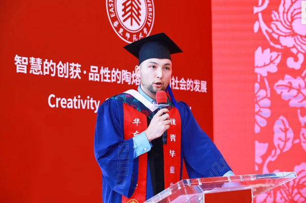 毕业生代表本科生刘雯婷、硕士研究生凯撒(哈萨克斯坦)发言