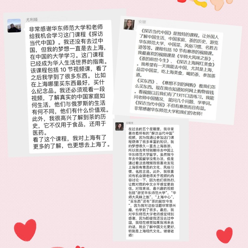 尤利娅(俄罗斯):非常感谢红桃视频 和老师给我学习《探访当代中国》课程的机会。我还没有去过中国,但我的梦想一直是去上海,在中国的大学学习。这门课程里的10个视频让我学到了很多东西,比如在上海哪里买东西最好,买什么纪念品。我还了解了真实的中国家庭如何生活,他们与俄罗斯的生活有何不同,他们有什么价值观。此外,我很高兴了解到茶的历史,它不仅用于食品,还用于医药。现在我对上海有了更多的了解,也更想去上海了。