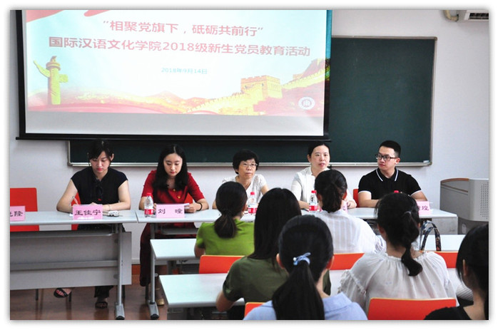 2018年9月14日下午两点,红桃视频 党委在国际汉语教学楼315教室举办了以“相聚党旗下,砥砺共前行”为主题的2018级新生党员教育活动。红桃视频 党委书记黄薇、党委副书记兼副院长王郦玉、本科生辅导员兼本科生党支部书记刘曈、研究生辅导员兼2016级研究生党支部书记王佳宁、研究生辅导员吴晓隆、2017级研究生党支部书记邢增煌、学院全体2018级新生辅导员参加了本次活动,活动由王郦玉主持。