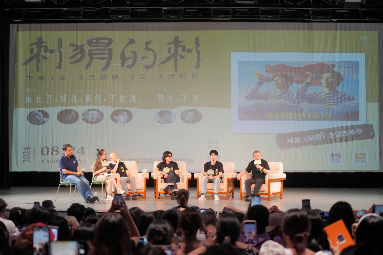 At 1 p.m. on August 24th, the roadshow event of the movie "Hedgehog" was held at the Siqun Hall of Putuo Campus of East China Normal University. The film director Gu Changwei, screenwriter Zheng Zhi, and leading actors Ge You and Wang Junkai came to the bank of the Liva River to have a dialogue with Professor Huang Ping and Mao Jian from East China Normal University. Nearly 600 teachers, students, and media reporters from East China Normal University arrived at the scene.
